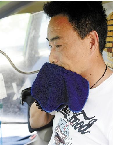 雖然開著空調(diào),但因?yàn)殚L時(shí)間暴曬,身上也一直出汗,抹把汗繼續(xù)開。