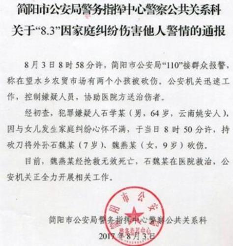8月3日8時58分,四川省簡陽市公安局“110”接到群眾報警,稱在簡陽市望水鄉(xiāng)農(nóng)貿(mào)市場有兩個小孩被一個60多歲的老人用刀猛砍,一個被砍倒在地上,傷勢嚴(yán)重,另一個被砍傷。接警后,簡陽公安機(jī)關(guān)迅速展開工作,在控制嫌疑人的同時,協(xié)助醫(yī)院方送治傷者。
