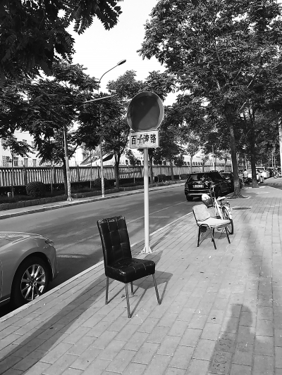 順著停車帶往東走,會(huì)看到身穿橙色制服的幾名男子騎著電動(dòng)自行車來回巡視,每當(dāng)有車從停車位開走,或者準(zhǔn)備停車時(shí),他們就會(huì)上前,從車的前擋風(fēng)玻璃取下小紙條,按上面的時(shí)間收錢。在這條路中段的人行道上,立著一把黃色的大傘,傘下面擺著兩把椅子,一名身穿淺藍(lán)色上衣的男子正在路邊喝水,所穿的衣服后背上印著“停車管理”四個(gè)字。他告訴記者:“這條路兩側(cè)路邊停車都是要收費(fèi)的,第一個(gè)小時(shí)6元,第二個(gè)小時(shí)9元!彼f因同村的老鄉(xiāng)有事,所以臨時(shí)來替他上幾天班。他指了指頭頂?shù)恼陉杺阏f,這把傘和沙發(fā)都是路邊一家金融公司提供的。