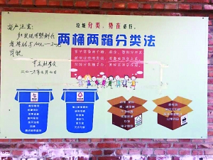 “我們選擇了最簡(jiǎn)便易行的方法,兩桶兩箱分類法,兩桶即一個(gè)桶裝廚余垃圾,另一個(gè)桶裝其他生活垃圾;兩箱即一個(gè)箱裝可回收物品,另一個(gè)箱裝電池、燈管等有毒有害物品!碧片摤撜f(shuō),接下來(lái)的兩個(gè)月時(shí)間里,他們辦了32次講座,通過(guò)集中培訓(xùn)、入戶宣傳、廣播宣傳、展板宣傳等方式,主要宣傳兩個(gè)重點(diǎn),為什么做和如何做。