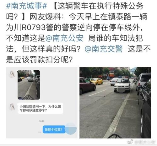 中新網(wǎng)8月13日電 據(jù)四川南充市公安局順慶區(qū)分局官方微博消息,2017年8月12日上午10時許,新浪微博用戶發(fā)帖稱“今天早上在鎮(zhèn)泰路一輛為川R****的警車逆向停在停車線外",質(zhì)疑警車“亂停放",順慶區(qū)分局發(fā)現(xiàn)該情況后立即組織人員開展調(diào)查工作。