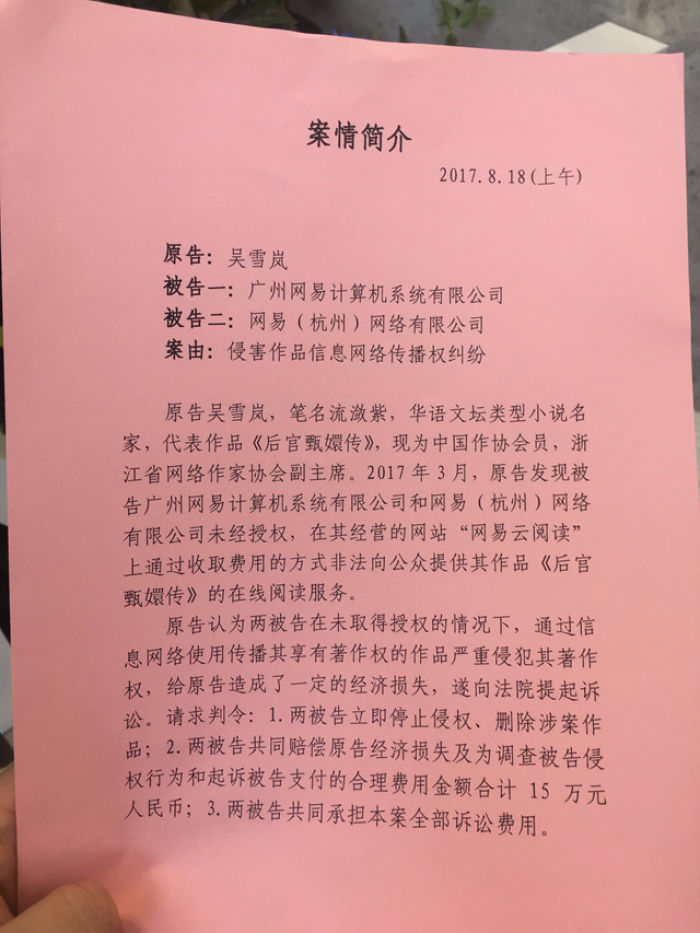 原告為《后宮甄嬛傳》作者,被告為網(wǎng)易公司,起訴案由是,網(wǎng)易未經(jīng)授權(quán),在其經(jīng)營的網(wǎng)站“網(wǎng)易云閱讀”上通過收費(fèi)方式非法向公眾提供《后宮甄嬛傳》的在線閱讀服務(wù)。涉及侵害作品信息網(wǎng)絡(luò)傳播權(quán)糾紛。