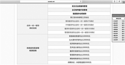 在網(wǎng)上搜索“考研培訓(xùn)”,無數(shù)培訓(xùn)機(jī)構(gòu)的宣傳網(wǎng)站即出現(xiàn)在眼前。北青報記者發(fā)現(xiàn),不同機(jī)構(gòu)的考研培訓(xùn)費用從數(shù)千到數(shù)萬元不等;在同一機(jī)構(gòu)內(nèi)部,由于培訓(xùn)形式、課程設(shè)置等方面的差異,課程價位也不盡相同,而這其中要價最高的則屬一些所謂的“保過班”、“協(xié)議班”,其學(xué)費甚至超過10萬元。