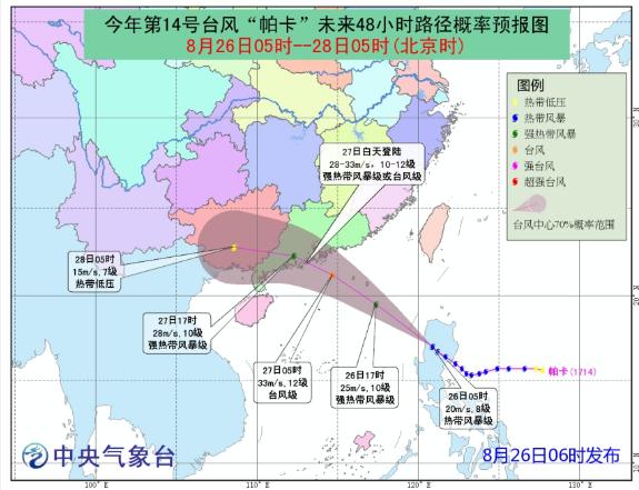 中央氣象臺預(yù)計,“帕卡”將以每小時30公里左右的速度向西北方向移動,將于26日中午前后移入南海東部海面,然后強度逐漸加強,并將于27日白天在廣東深圳到陽江一帶沿海登陸(28-33米/秒,10-12級,強熱帶風(fēng)暴級或臺風(fēng)級),登陸后“帕卡”將轉(zhuǎn)向偏西方向移動, 27日晚上移入廣西境內(nèi)(18-25米/秒,8-10級,熱帶風(fēng)暴級或強熱帶風(fēng)暴級),強度逐漸減弱。