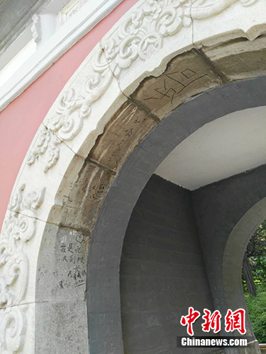慈濟(jì)寺山門雖已經(jīng)過粉刷,但門洞中仍能看到不少涂鴉。中新網(wǎng)記者 宋宇晟 攝
