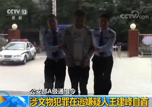 王建峰系陜西省咸陽市淳化縣公安機關正在偵辦的一起重大文物案件的主犯之一。2016年11月10日,陜西省淳化縣公安機關對王建峰作出刑事拘留決定并進行網上追逃,此后開展了大量摸排、研判、查緝等工作,但一直未能抓獲。7月31日公安部發(fā)布A級通緝令通緝10名重大文物犯罪逃犯后,淳化縣公安機關進一步加大緝捕力度,同時安排民警做其家屬思想工作,督促其主動投案自首,爭取從寬處理。在公安機關的全力緝捕和工作施壓下,王建峰向陜西省淳化縣公安機關投案自首。