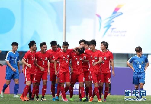 在第十三屆全運會足球男子20歲以下年齡組比賽中,上海隊以4比2戰(zhàn)勝江蘇隊。 新華社記者 曹燦攝