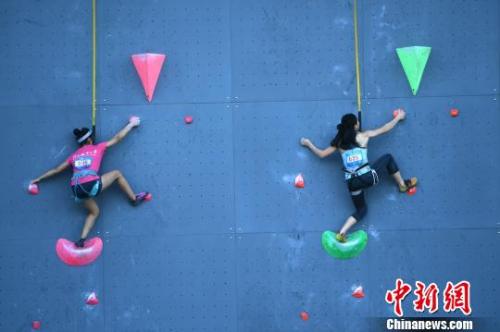第十三屆全運會群眾項目攀巖決賽女子隨機速度賽比賽現(xiàn)場。 陳超 攝