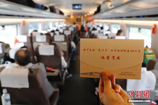 中新社北京9月21日電 (記者 周音)9月21日起,7對“復(fù)興號”動(dòng)車組在京滬高鐵按時(shí)速350公里運(yùn)行,分別擔(dān)當(dāng)G1/G2、G3/G4、G5/G6、G7/G8、G9/G10、G13/G14、G17/G18次,京滬之間全程運(yùn)行時(shí)間僅4個(gè)半小時(shí)左右,縮短了京滬兩地間時(shí)空距離。
