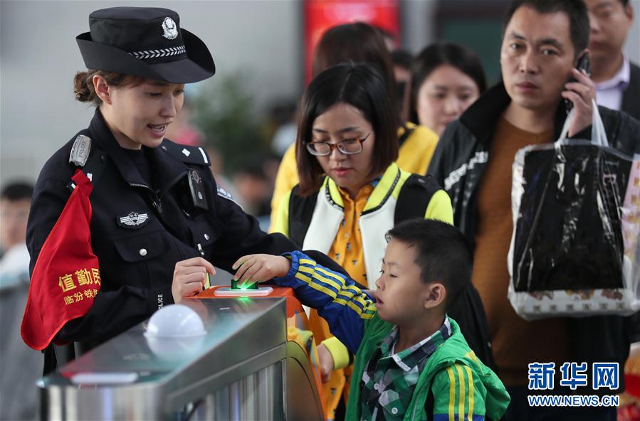 10月7日,在山西運城北站,1名小朋友在執(zhí)勤民警的幫助下進站。隨著國慶、中秋假期接近尾聲,全國鐵路迎來返程客流高峰。新華社發(fā)(鮑東升 攝)