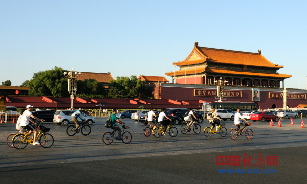 資料圖片:2017年9月17日,北京。市民騎共享單車行駛在天安門前及長安街上。