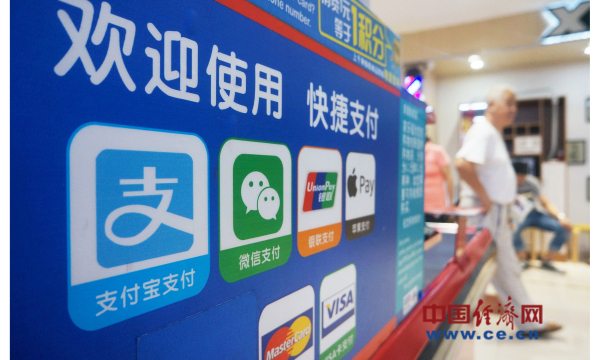 資料圖片:2017年9月6日,顧客從杭州一家超市的微信支付、支付寶等非銀支付標(biāo)識前走過。