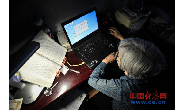 資料圖片:2017年5月17日,天津。薛敏修在利用電腦學(xué)習(xí)。2014年,78歲的薛敏修正式成為天津大學(xué)現(xiàn)代遠(yuǎn)程教育電子商務(wù)專業(yè)的本科學(xué)生。