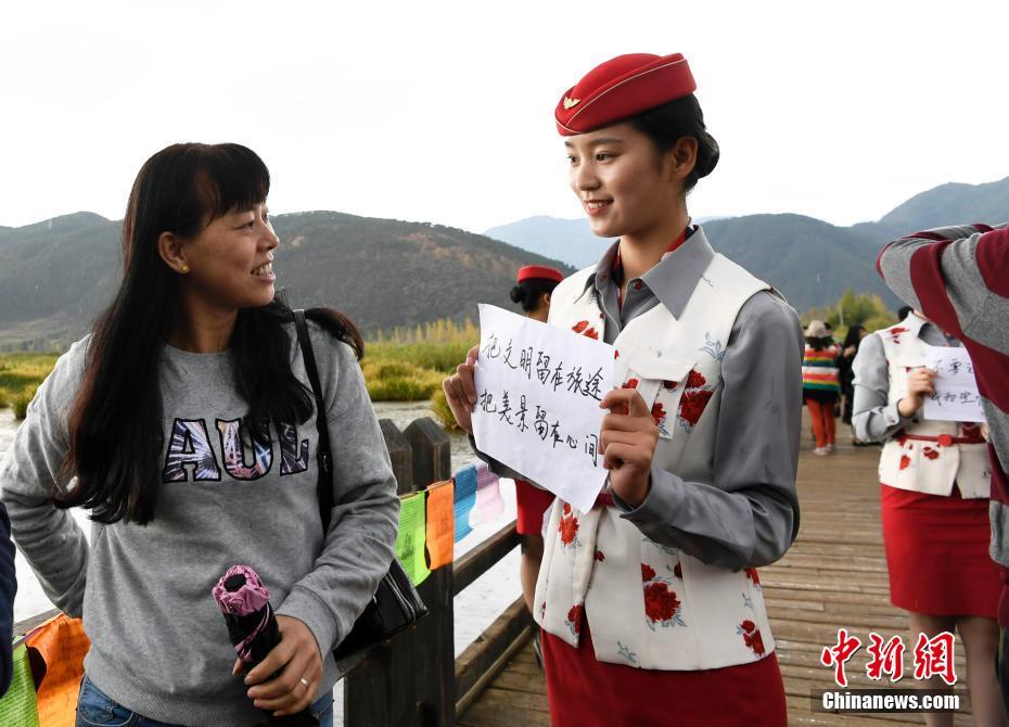 10月15日,四川西南航空專修學(xué)院的一群準(zhǔn)空姐空少作為志愿者現(xiàn)身四川鹽源瀘沽湖景區(qū),身體力行倡導(dǎo)生態(tài)環(huán)保。學(xué)生們走上當(dāng)?shù)刂摹白呋闃颉保蛴慰蛡冃麄鳝h(huán)保知識。