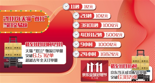 “剁手黨們”創(chuàng)造了新的“世界紀(jì)錄”。天貓“雙11”交易額11秒破億元,28秒破10億元,3分01秒破百億元,40分12秒破500億元,9小時(shí)破1000億元,刷新每個(gè)紀(jì)錄的時(shí)間,幾乎都只有去年用時(shí)的一半。