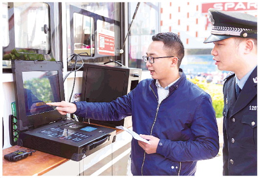 從12月18日起,廣東省梅州市市民就可以在家門口的警務(wù)車上自助辦理身份證損壞換領(lǐng)、丟失補(bǔ)領(lǐng)等業(yè)務(wù)了。據(jù)介紹,梅州警方不斷增加移動警務(wù)車業(yè)務(wù)模塊,將遍布全市重要巡防點(diǎn)的28臺移動警務(wù)車升級成“一車通辦、一窗通辦”模式,把更多便民服務(wù)送進(jìn)村居、企業(yè)、學(xué)校等。圖為群眾在移動警務(wù)車上自助辦理身份證業(yè)務(wù)。(記者 鄧新建 通訊員 候奇生 攝)