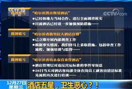 好了,因為版面所限,我們實在是沒法再列出來它還能做什么事。那么所有的這些細節(jié),哈爾濱的衛(wèi)計委官方回應,是確定屬實。那么在這個屬實的情況下,我們再來看一下這三家涉事酒店的官方微博的回應是什么。