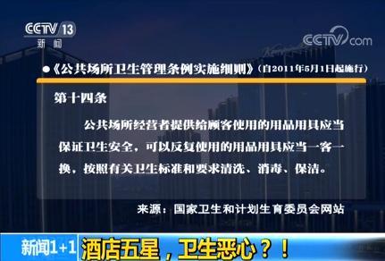 董倩:作為住店的客人,我們都有一個希望,就是不管它是有星還是沒星,有星的話是幾星,都希望它能夠干凈、能夠消毒。那么對于這樣一種愿望,我們國家有沒有相應的規(guī)定。有,我們來看一下。這是我們國家有一個《公共場所衛(wèi)生管理條例實施細則》,從11年5月就開始施行了,且實施了。其中有一個第十四條,里面明文寫道,公共場所經營者提供給顧客使用的用品用具應當保證衛(wèi)生安全,可以反復使用的用品用具應當一客一換,按照有關衛(wèi)生標準和要求清洗、消毒、保潔。