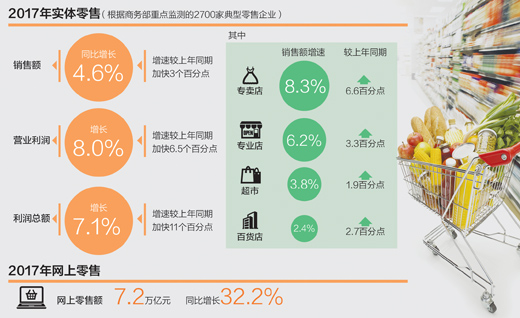 商務(wù)部近日發(fā)布的數(shù)據(jù)顯示,去年我國實(shí)體零售發(fā)展態(tài)勢良好,重點(diǎn)監(jiān)測的2700家典型企業(yè)銷售額同比增長4.6%,增速較上年同期加快3個(gè)百分點(diǎn)。去年我國網(wǎng)上零售額突破7.2萬億元,同比增長32.2%。