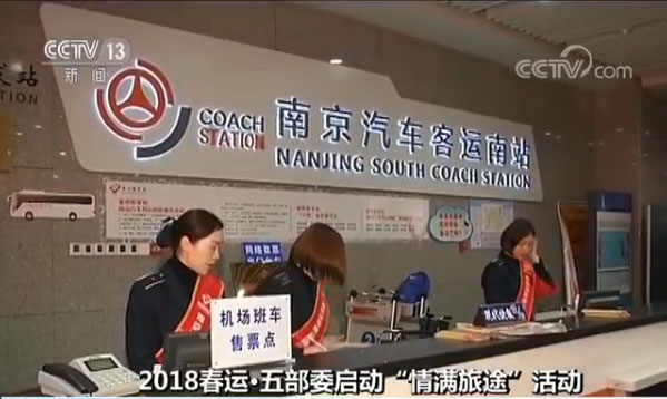 央視網(wǎng)消息:2月1日,交通運(yùn)輸部、公安部、國家安全生產(chǎn)監(jiān)督管理總局、中華總工會、共青團(tuán)中央在南京聯(lián)合啟動2018年春運(yùn)"情滿旅途"活動;顒右浴坝H情伴春運(yùn),溫暖在旅途”為主題,旨在讓旅客出行更便捷、更安全、更舒心。