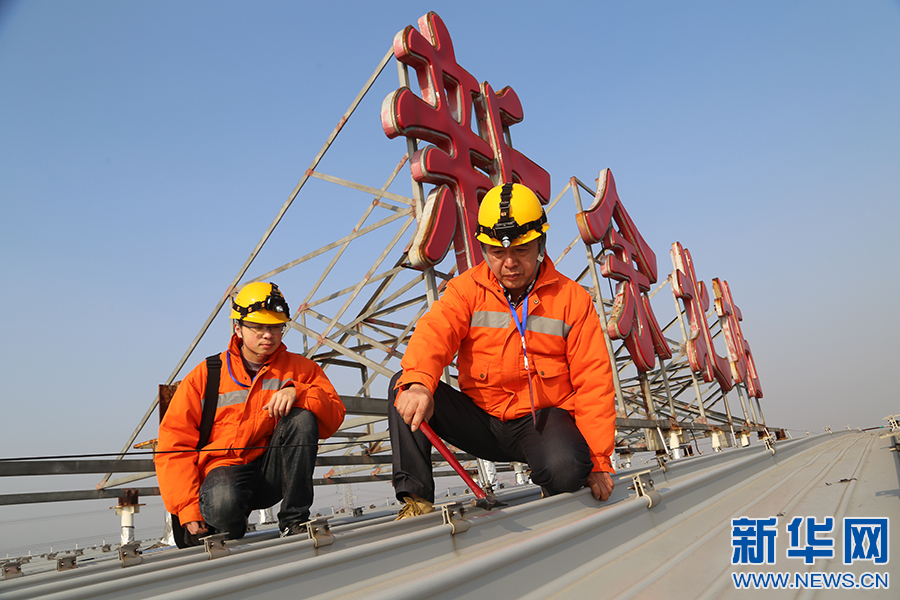 徐小云和李浩翔站在屋面,用望遠(yuǎn)鏡對(duì)站臺(tái)雨棚頂部進(jìn)行檢查。