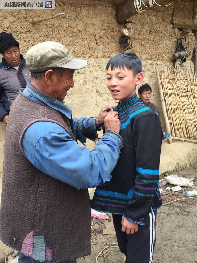得知要去給列車送禮物,爺爺莫色久哈為孫子里呷換上新衣服。
