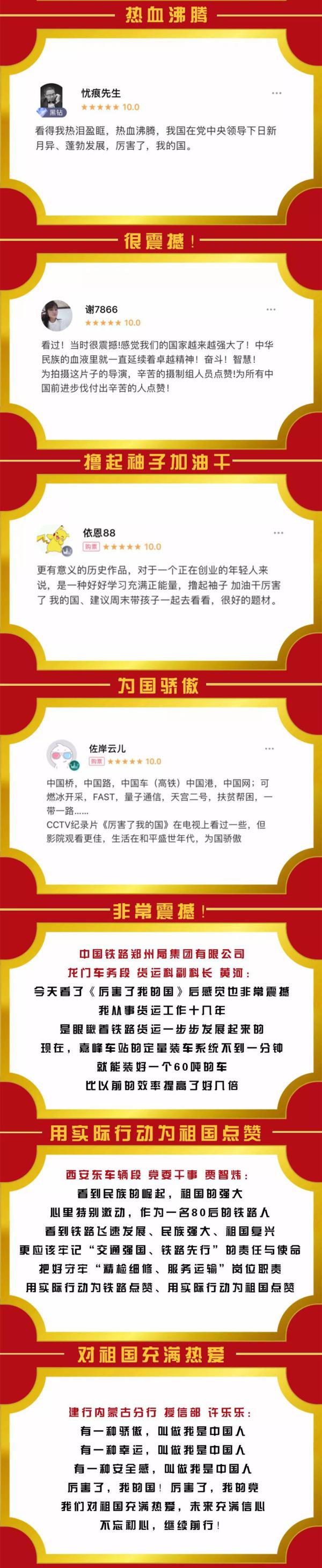 “‘我的國’成就‘我的家’,‘我的家’推動‘我的國’!标兾魇”kU行業(yè)協(xié)會辦公室主任帖炳楠看過電影,深有感觸:人民生活的興旺離不開國家的繁榮富強,國家每一項重大進展也凝聚了全國人民的磅礴力量。