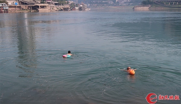 圖說(shuō):在江中游泳的人們。黃佳琪 攝