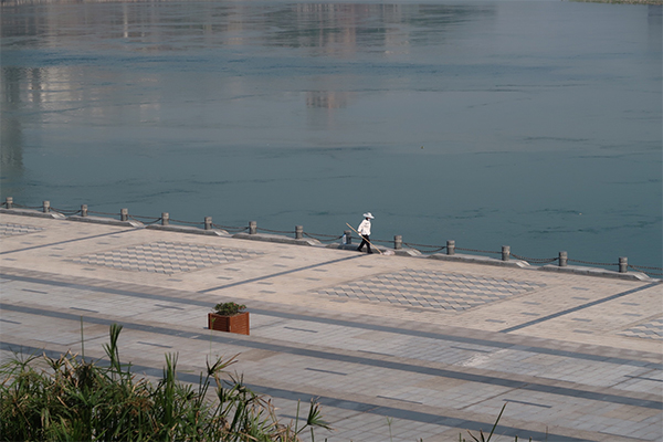 圖說(shuō):長(zhǎng)江公園親水步道上,每隔幾十米就有環(huán)衛(wèi)工人清掃地面。黃佳琪 攝