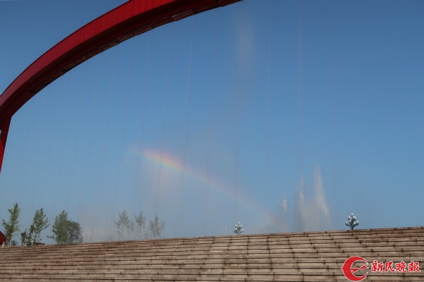 圖說(shuō):目前全國(guó)最大的室外天幕,可結(jié)合水、聲、光、電手段營(yíng)造出美輪美奐的水幕表演。黃佳琪 攝