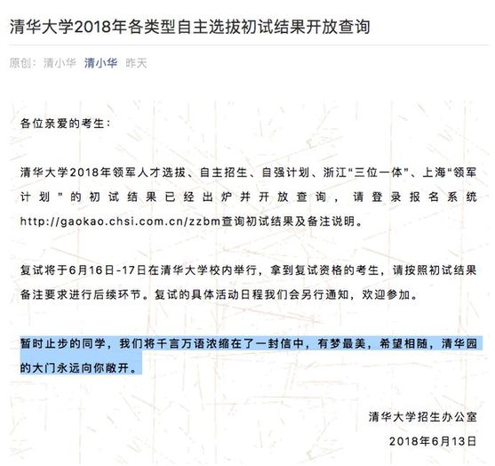 “暫時(shí)止步的同學(xué),我們將千言萬(wàn)語(yǔ)濃縮在了一封信中,有夢(mèng)最美,希望相隨,清華園的大門(mén)永遠(yuǎn)向你敞開(kāi)!