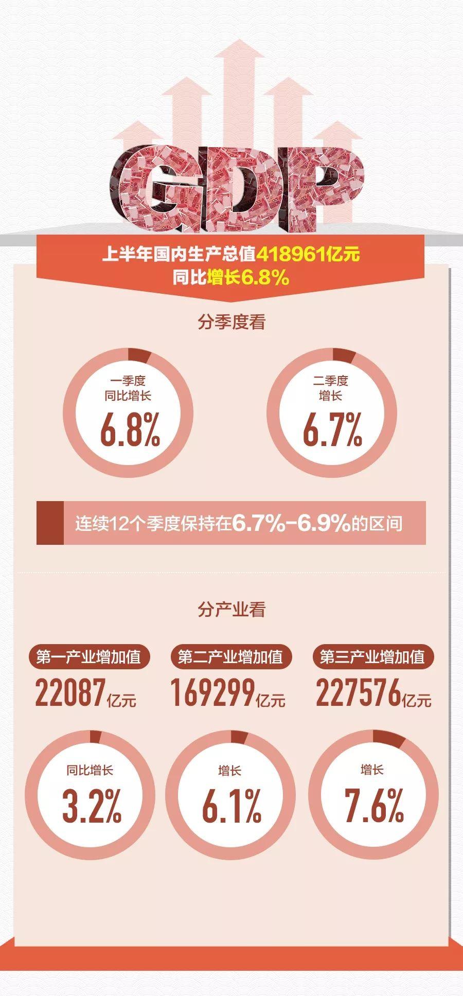 初步核算,上半年國內(nèi)生產(chǎn)總值418961億元,同比增長6.8%。其中,第一產(chǎn)業(yè)同比增長3.2%,第二產(chǎn)業(yè)增長6.1%,第三產(chǎn)業(yè)增長7.6%。