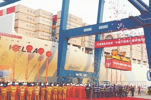 2007年11月28日,中國(guó)大陸港口當(dāng)年第一億個(gè)集裝箱緩緩在天津港五洲國(guó)際碼頭起吊。