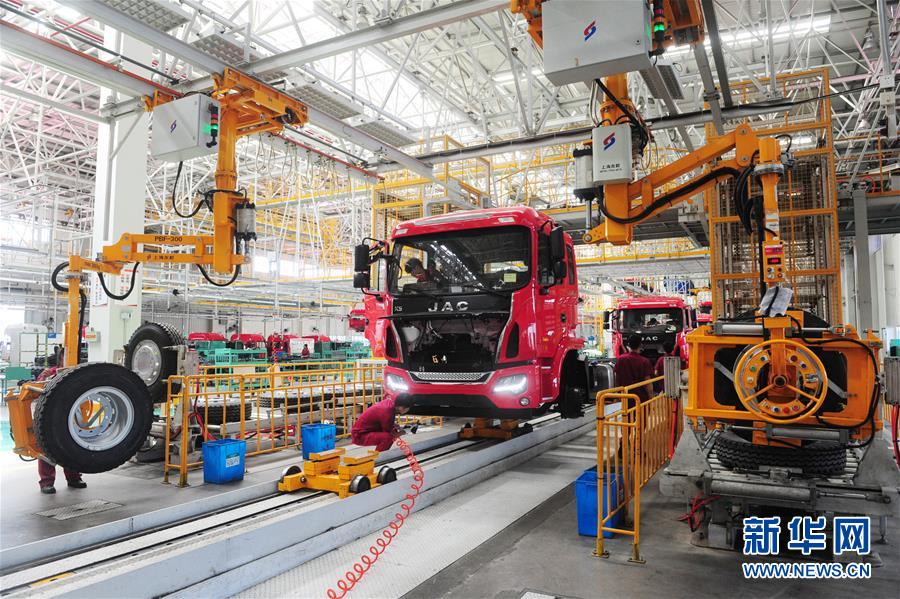 技術工人在安徽江淮汽車集團股份有限公司阜陽分公司江淮汽車總裝車間生產(chǎn)線上組裝卡車(7月12日攝)。新華社發(fā)(王彪 攝)