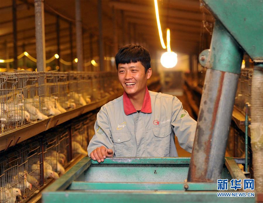 河北省海興縣張會亭鄉(xiāng)徐西北村建檔立卡貧困戶徐寶龍在政府幫助扶持建起的養(yǎng)雞場里工作(12月11日攝)。新華社記者 牟宇 攝