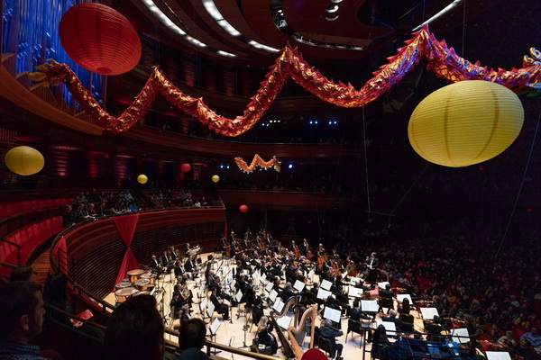 擁有2500個座位的音樂廳上空懸掛著兩條中國龍,費城交響樂團和遠道而來的上海愛樂樂團同臺,聯(lián)袂奏響了“費城首屆中國新年音樂會”。