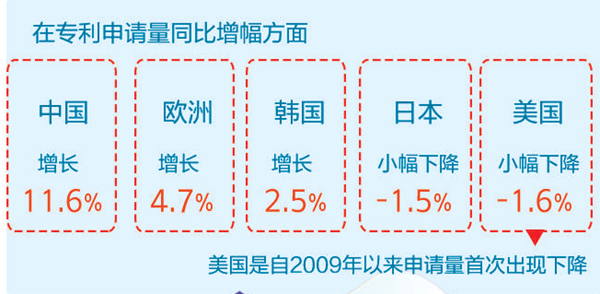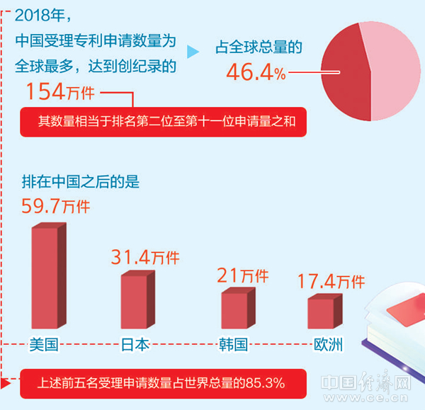 報(bào)告顯示,中國專利申請數(shù)量繼續(xù)在全球領(lǐng)先。2018年,中國受理專利申請數(shù)量為全球最多,達(dá)到創(chuàng)紀(jì)錄的154萬件,占全球總量的46.4%,其數(shù)量相當(dāng)于排名第二位至第十一位申請量之和。排在中國之后的是美國(59.7萬件)、日本(31.4萬件)、韓國(21萬件)和歐洲(17.4萬件),上述前五名受理申請數(shù)量占世界總量的85.3%。