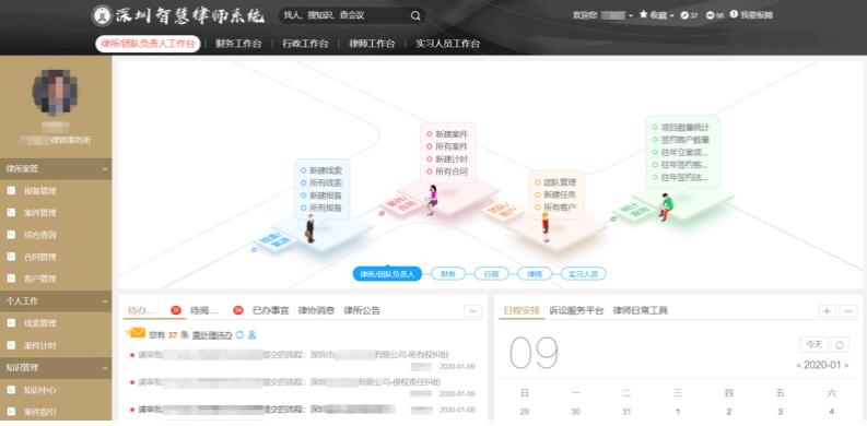 深圳智慧律師系統(tǒng)以多入口匯集PC工作臺(tái)、移動(dòng)工作臺(tái)、報(bào)表中心、角色門戶等多平臺(tái),在對(duì)接外部系統(tǒng)時(shí)采用了異構(gòu)系統(tǒng)集成和自由系統(tǒng)鏈接的方式,區(qū)分不同登錄主體身份配置不同的工作臺(tái),所適用界面與功能也因登錄主體身份不同可獲精確應(yīng)用。例如,以律師身份登錄所展示的有五大功能模塊:律所案管、個(gè)人工作、知識(shí)管理、會(huì)員服務(wù)、訴訟服務(wù),主體界面重點(diǎn)突出律師的案件管理和與律所管理的協(xié)同。