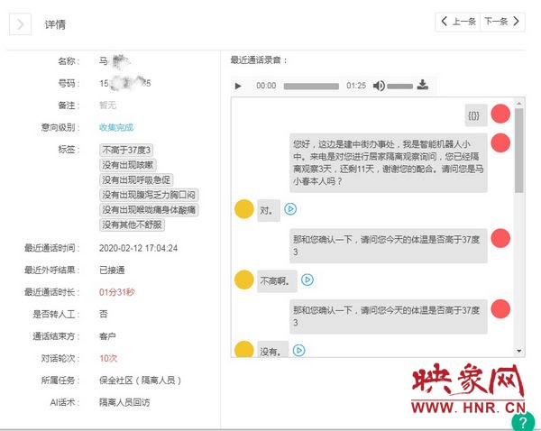 自1月25日以來,街道組織300余人,通過兩天時(shí)間對(duì)轄區(qū)4.29萬戶家庭10.5萬人進(jìn)行了入戶排查。為避免排查時(shí)期有人員外出導(dǎo)致遺漏等情況,進(jìn)一步建全建細(xì)檔案臺(tái)賬,街道使用AI人工智能外呼平臺(tái),導(dǎo)入社區(qū)居民信息,對(duì)全部居民進(jìn)行二次電話排查,每次排查居民僅需回答“是”或者“不是”等簡(jiǎn)單語言即可完成身份信息、活動(dòng)區(qū)域、接觸人群、癥狀等信息的排查,AI排查結(jié)果與前期排查進(jìn)行比對(duì),提高了排查工作的效率和質(zhì)量。