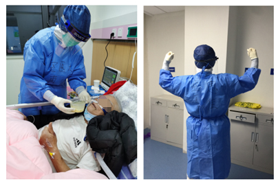 記得剛開(kāi)始穿防護(hù)服進(jìn)病房,小伙伴們緊張害怕,緊張自己的防護(hù)服是否嚴(yán)密包裹自己,是否有任何暴露的風(fēng)險(xiǎn)。害怕的是,因?yàn)槭堑谝淮谓邮詹∪,能否合理安排好工作秩序,能否可以和病人順利交流等諸多問(wèn)題。隨著時(shí)間的推移,在摸索中一步步前進(jìn),轉(zhuǎn)眼間,一個(gè)月快過(guò)去了,我們已經(jīng)適應(yīng)了穿防護(hù)服的日子,適應(yīng)了每天過(guò)的跟打仗似的日子。