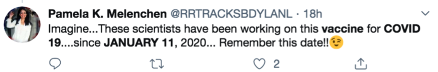 網(wǎng)民Pamela K.Melenchen稱,“想想看,這些科學(xué)家從1月11日就開始進(jìn)行疫苗研發(fā)了,請記住這個(gè)日期!”↓↓↓