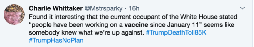 科學(xué)家查理·惠特克(Charlie Whittaker)稱:“總統(tǒng)說人們自從1月11日就開始研發(fā)疫苗,這真的很有趣,似乎有人早就知道我們面對的是什么!薄