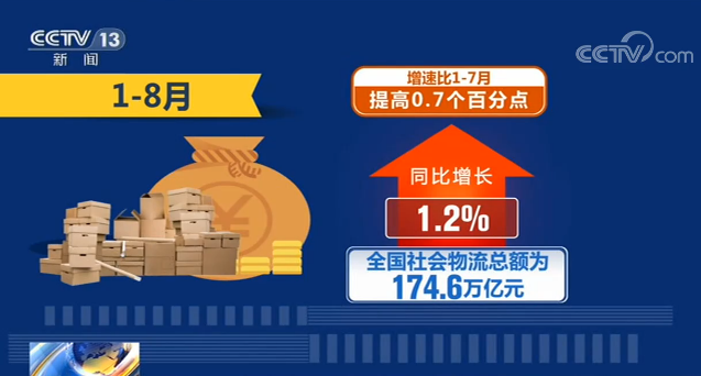 1—8月,全國(guó)社會(huì)物流總額為174.6萬(wàn)億元,同比增長(zhǎng)1.2%,增速比1—7月提高0.7個(gè)百分點(diǎn)。