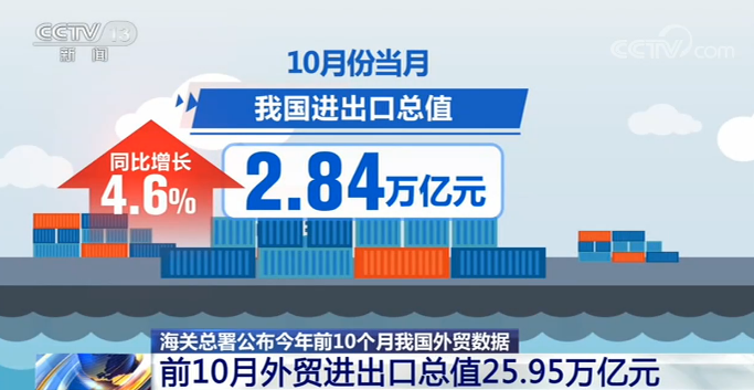 海關(guān)統(tǒng)計(jì)數(shù)據(jù)顯示,今年前10個(gè)月,我國(guó)外貿(mào)進(jìn)出口總值25.95萬億元人民幣,同比增長(zhǎng)1.1%。