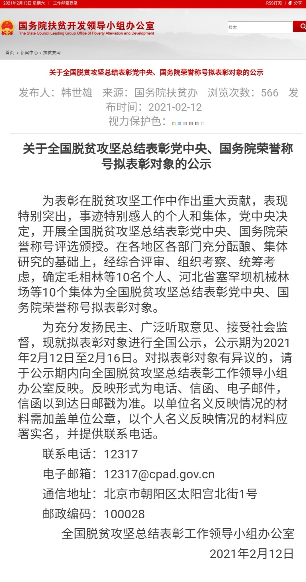 為充分發(fā)揚民主、廣泛聽取意見、接受社會監(jiān)督,現就擬表彰對象進行全國公示,公示期為2021年2月12日至2月16日。對擬表彰對象有異議的,請于公示期內向全國脫貧攻堅總結表彰工作領導小組辦公室反映。(總臺央視記者 施韶宇 鄭天皓)