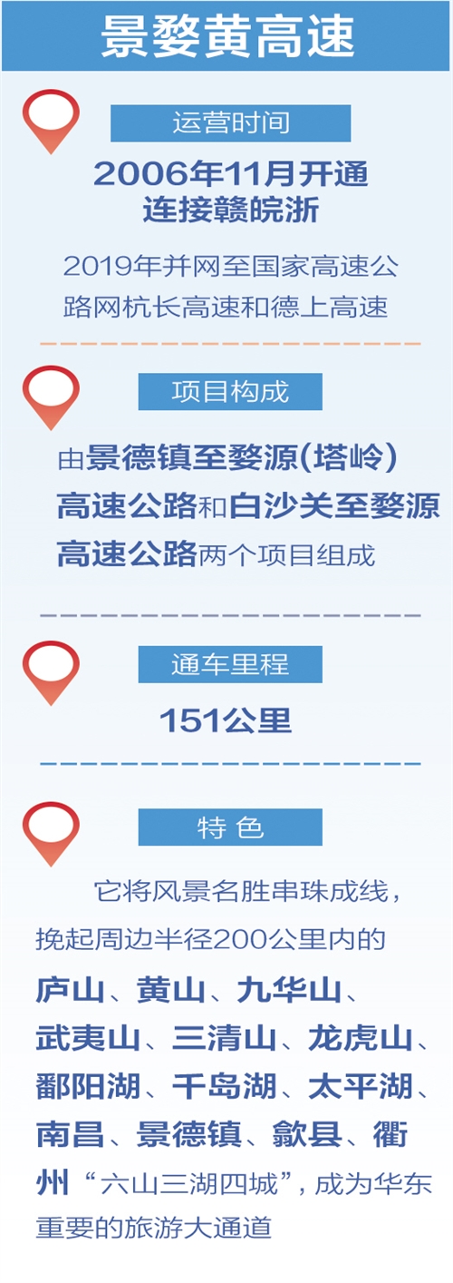 “滬、杭、黃(山)、婺源、景德鎮(zhèn)、九(江)是我國(guó)最具開(kāi)發(fā)潛力的旅游經(jīng)濟(jì)干線之一,景婺黃高速公路的開(kāi)通,大大縮短了相互間的時(shí)空距離,形成贛皖浙滬旅游風(fēng)光帶!苯魇〗煌ㄍ顿Y集團(tuán)景德鎮(zhèn)管理中心黨委副書(shū)記章勇說(shuō)。
