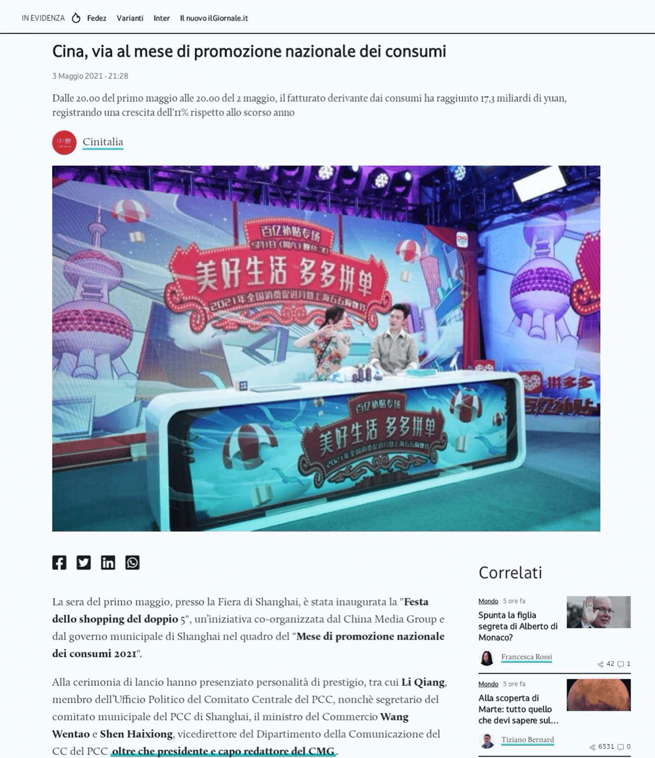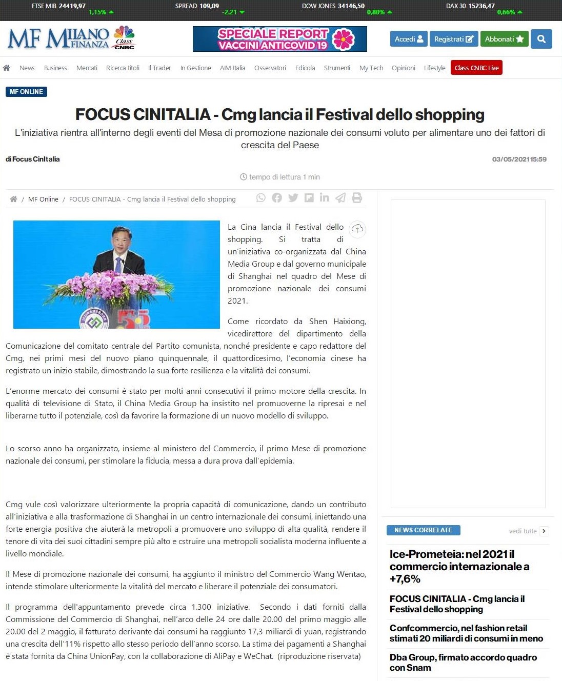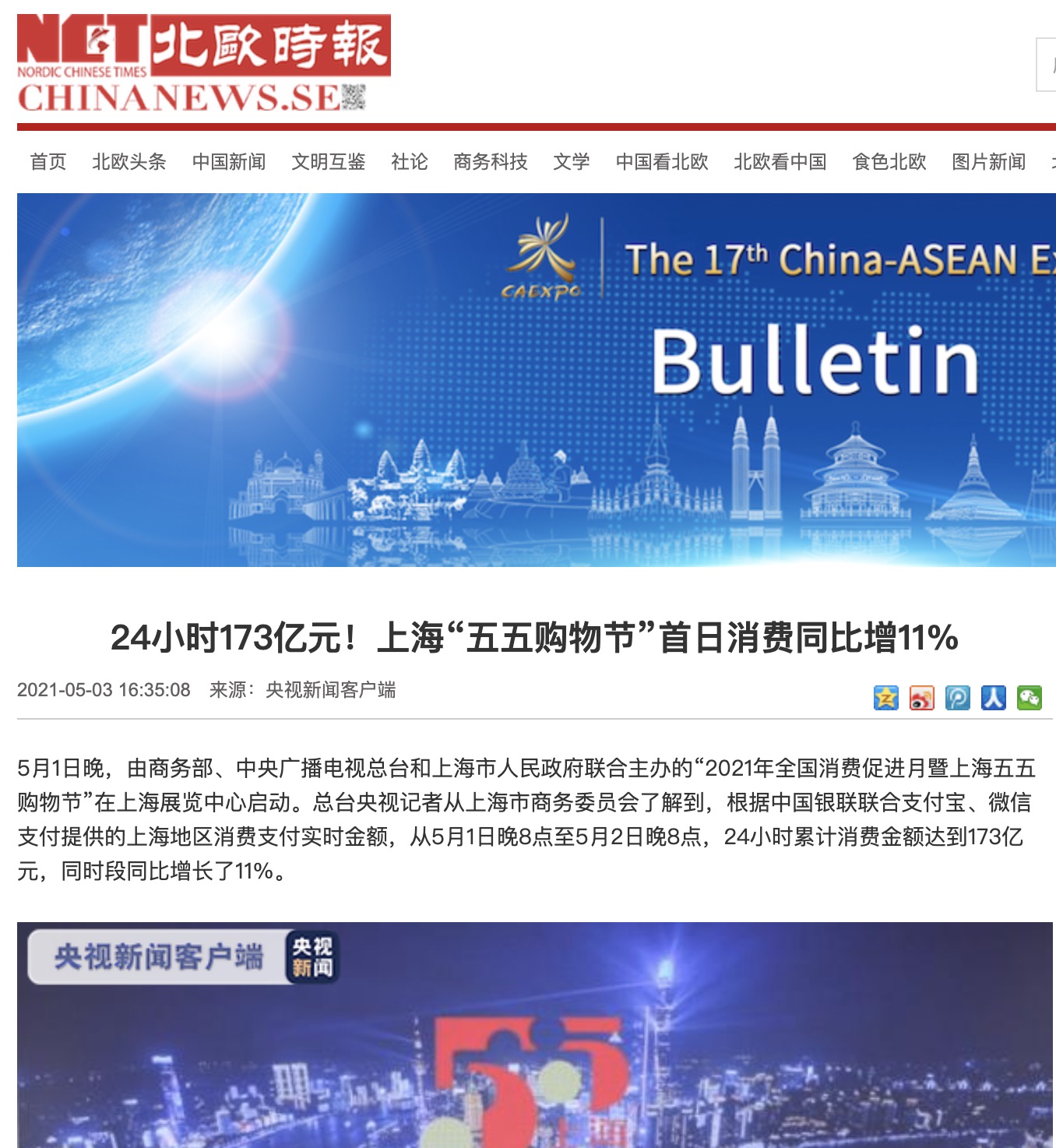 活動(dòng)引發(fā)海外媒體廣泛關(guān)注。截至5月4日,美國(guó)全國(guó)廣播公司CNBC財(cái)經(jīng)頻道、《歐洲時(shí)報(bào)》德文網(wǎng)、《北歐時(shí)報(bào)》網(wǎng)站、意大利《米蘭財(cái)經(jīng)報(bào)》網(wǎng)站、意大利《日?qǐng)?bào)》網(wǎng)站、挪威國(guó)家廣播電視一臺(tái)(NRK 1)、日本最大的中國(guó)資訊門戶網(wǎng)站Record China、印度《每日力量報(bào)》網(wǎng)站、土耳其經(jīng)濟(jì)觀察網(wǎng)、《哈薩克斯坦實(shí)業(yè)報(bào)》網(wǎng)站、保加利亞新聞門戶網(wǎng)站“24小時(shí)”、埃及《今日消息報(bào)》、尼日利亞《領(lǐng)導(dǎo)者報(bào)》網(wǎng)站、尼羅河國(guó)際電視臺(tái)(Nile TV International)、越南國(guó)家電視臺(tái)綜合頻道(VTV1)、印尼艾爾辛達(dá)新聞網(wǎng)、柬埔寨Freshnews網(wǎng)站以及香港大公報(bào)、文匯報(bào)紛紛轉(zhuǎn)載轉(zhuǎn)引。多家媒體表示,中國(guó)經(jīng)濟(jì)在“十四五”規(guī)劃的第一個(gè)春天迎來穩(wěn)健開局,消費(fèi)市場(chǎng)規(guī)模持續(xù)擴(kuò)大成為發(fā)展動(dòng)力。