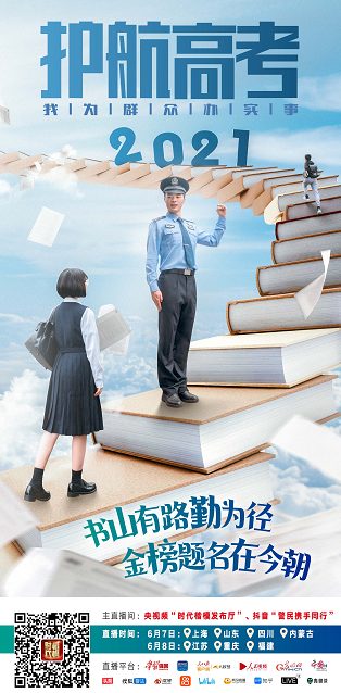 中國(guó)警察網(wǎng)北京6月4日電 記者邵磊報(bào)道:2021年全國(guó)高考即將拉開帷幕,6月7日、8日,公安部新聞宣傳局將聯(lián)合中央廣播電視總臺(tái)綜合頻道“時(shí)代楷模發(fā)布廳”,開展公安機(jī)關(guān)“我為群眾辦實(shí)事·護(hù)航高考2021”兩場(chǎng)“云”直播活動(dòng),多地公安機(jī)關(guān)接力直播,每天早7時(shí)30分開始,每場(chǎng)時(shí)長(zhǎng)約1.5小時(shí)。