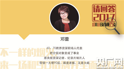 鄧?yán)伲?0、70跨界資深職場人代表,把介紹對象變成了事業(yè),原央視資深記者、紀(jì)錄片制片人,帶領(lǐng)一大幫90后,既是老板,又是大姐。