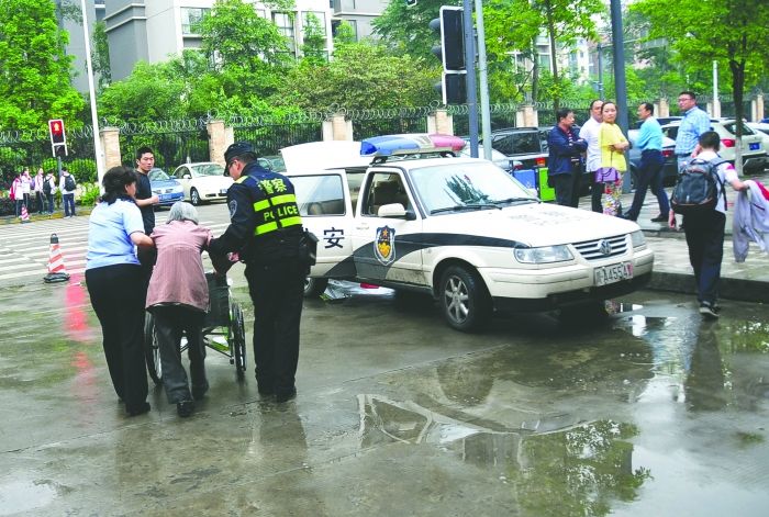 李婆婆在成都七中初中學(xué)校門(mén)口得到民警幫助。鐘先生供圖